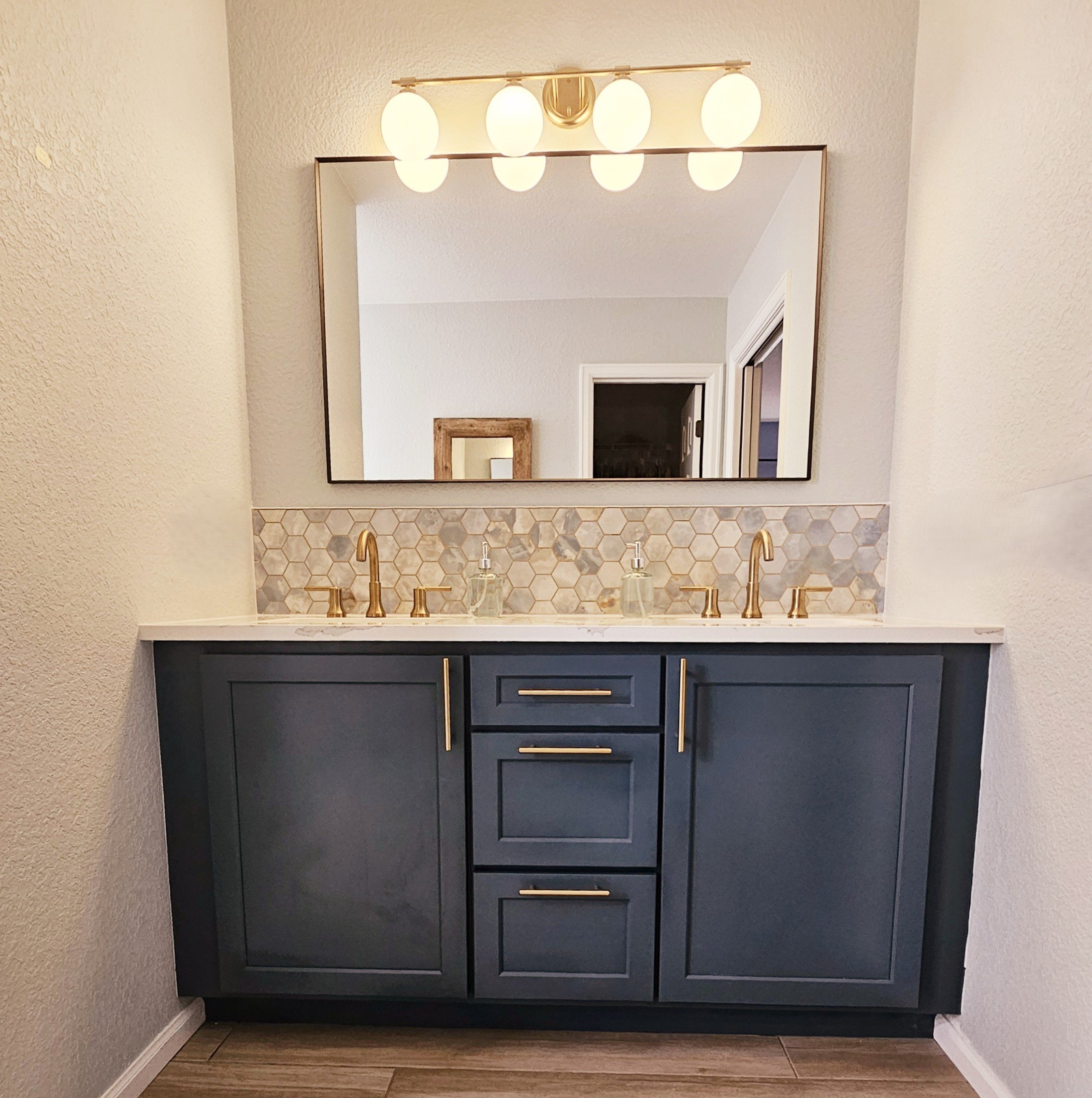 A vanity that earns a second look — and a third. The iridescent hexagon tile backsplash catches the light differently at every hour, while the globe sconce bar above casts an even, flattering glow across the quartz countertop. Brushed gold hardware runs consistently from the bar pulls to the faucets, giving the whole composition a quiet cohesion. Dual undermount sinks and thoughtfully placed drawer storage make this vanity as functional as it is striking. It's the kind of piece that anchors a room — and quietly sets the standard for everything around it.