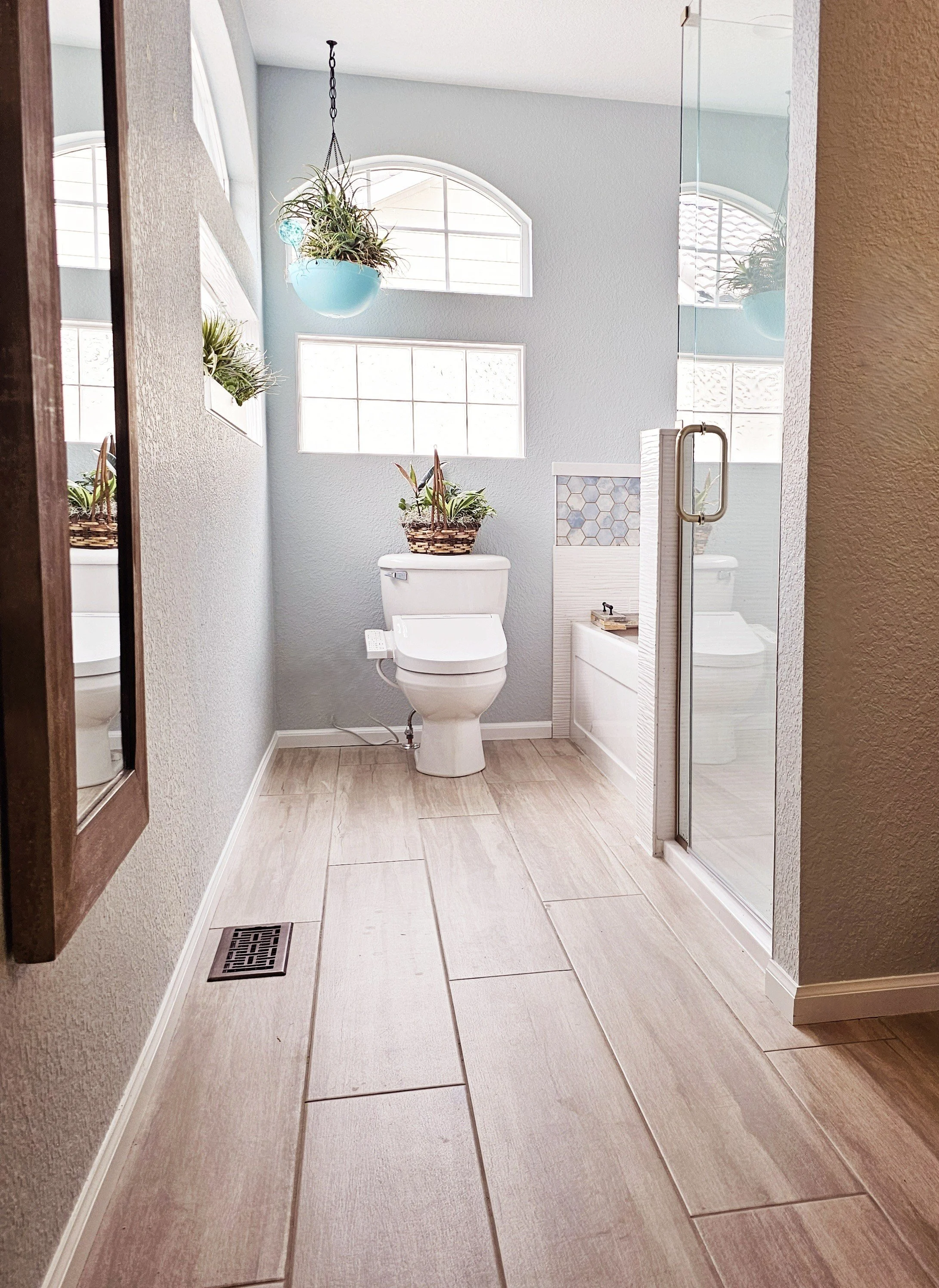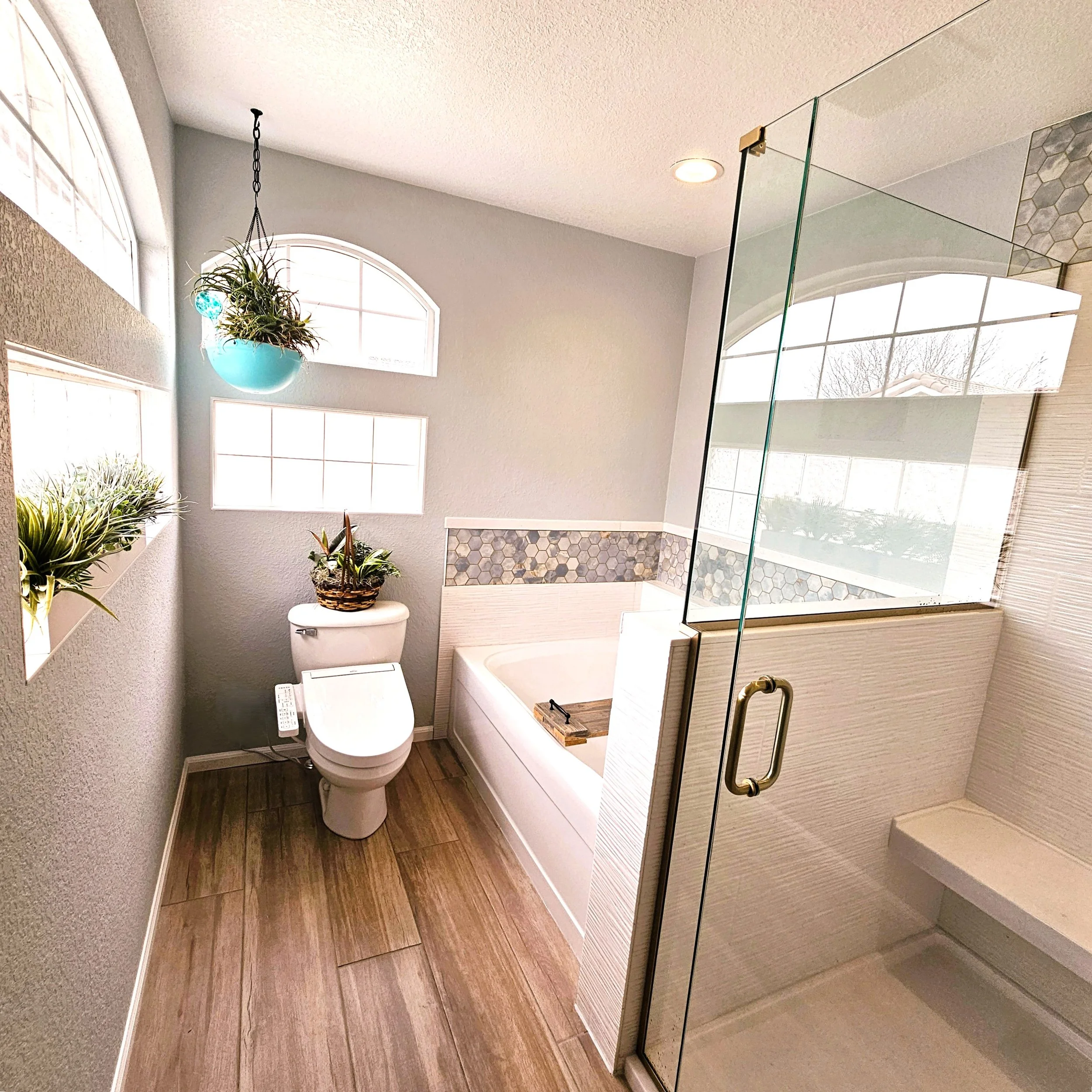 This view tells the rest of the story — a full primary bath flooded with natural light from an arched window that anchors the entire room. Wood-look tile flooring runs wall to wall, bringing warmth underfoot without sacrificing the clean, airy palette. The iridescent hexagon border weaves through the space as a unifying thread, connecting the tub surround to the shower seamlessly. A built-in shower bench and thoughtful storage speak to the functional thinking behind every design decision. Plants, light, and intention — this is a bathroom designed to feel like a retreat.