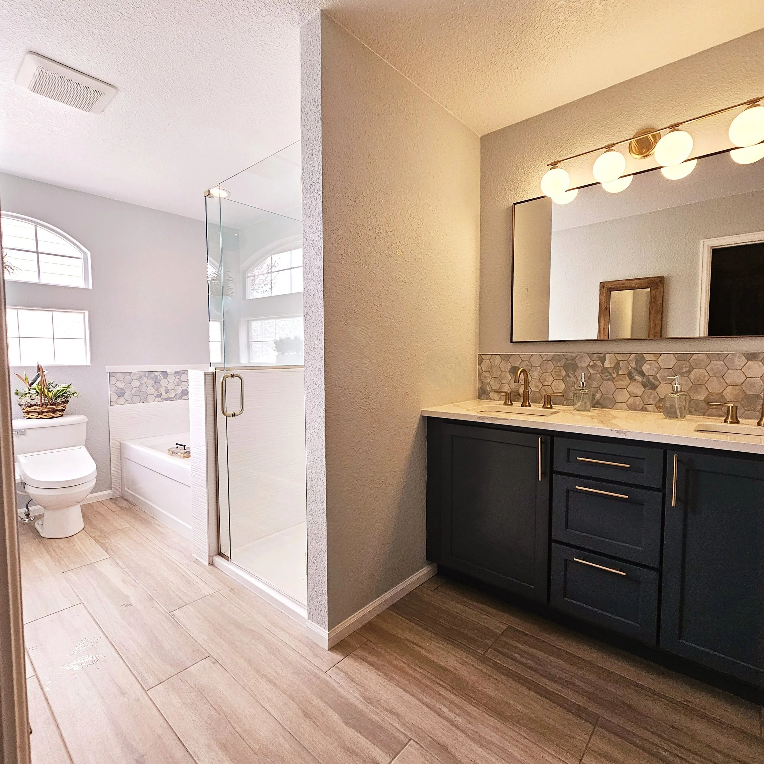 This is the room in full — and it delivers on every promise made in the design. A bold navy double vanity commands the right wall, its deep tone a striking counterpoint to the warm gold hardware and hexagon tile backsplash above. Globe sconces cast a soft, flattering light across the quartz countertop and dual undermount sinks. Beyond the frameless glass enclosure, the soaking tub and arched window complete the picture — light pouring in, greenery in the sill, and the wood-look tile floor running seamlessly beneath it all. Two spaces, one vision, nothing left unconsidered.