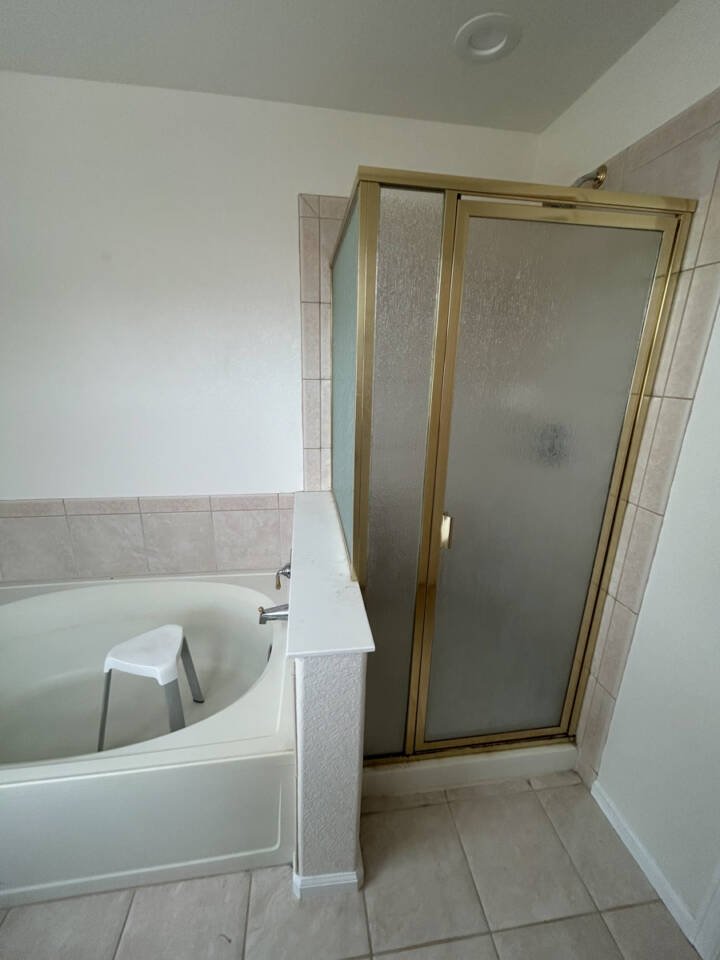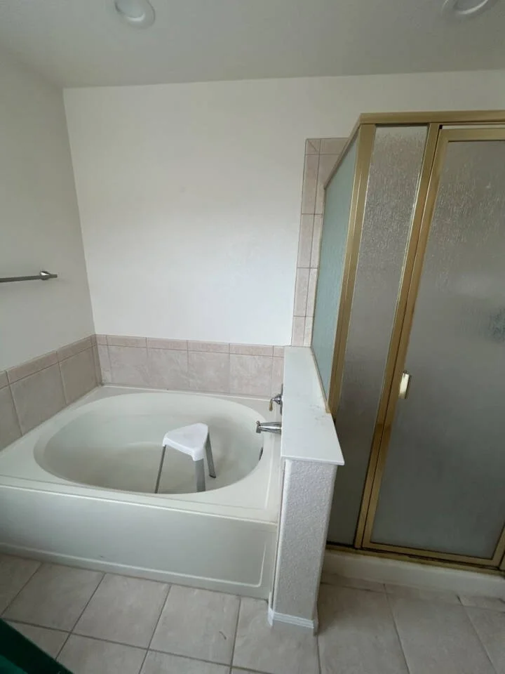 What was once a builder-grade bath with good bones and little inspiration has become one of the most personal rooms in the home. The potential was always there — the layout, the light, the generous proportions — it simply needed the right vision to unlock it. From the ground up, every surface was reconsidered and every finish deliberately chosen. Warm wood-look tile replaced what was there before, setting a new tone from the moment you step inside. A bold double vanity with brushed gold hardware anchors one wall, while an iridescent hexagon tile border weaves through the tub surround and vanity backsplash as a unifying signature. A frameless glass enclosure opens the shower to the room, and the soaking tub beneath the arched window invites you to slow down and stay awhile. Globe sconces, quartz countertops, lush greenery, and thoughtful storage complete a space that feels simultaneously fresh and deeply personal. The before was just the beginning of the conversation — this is where it ended up.