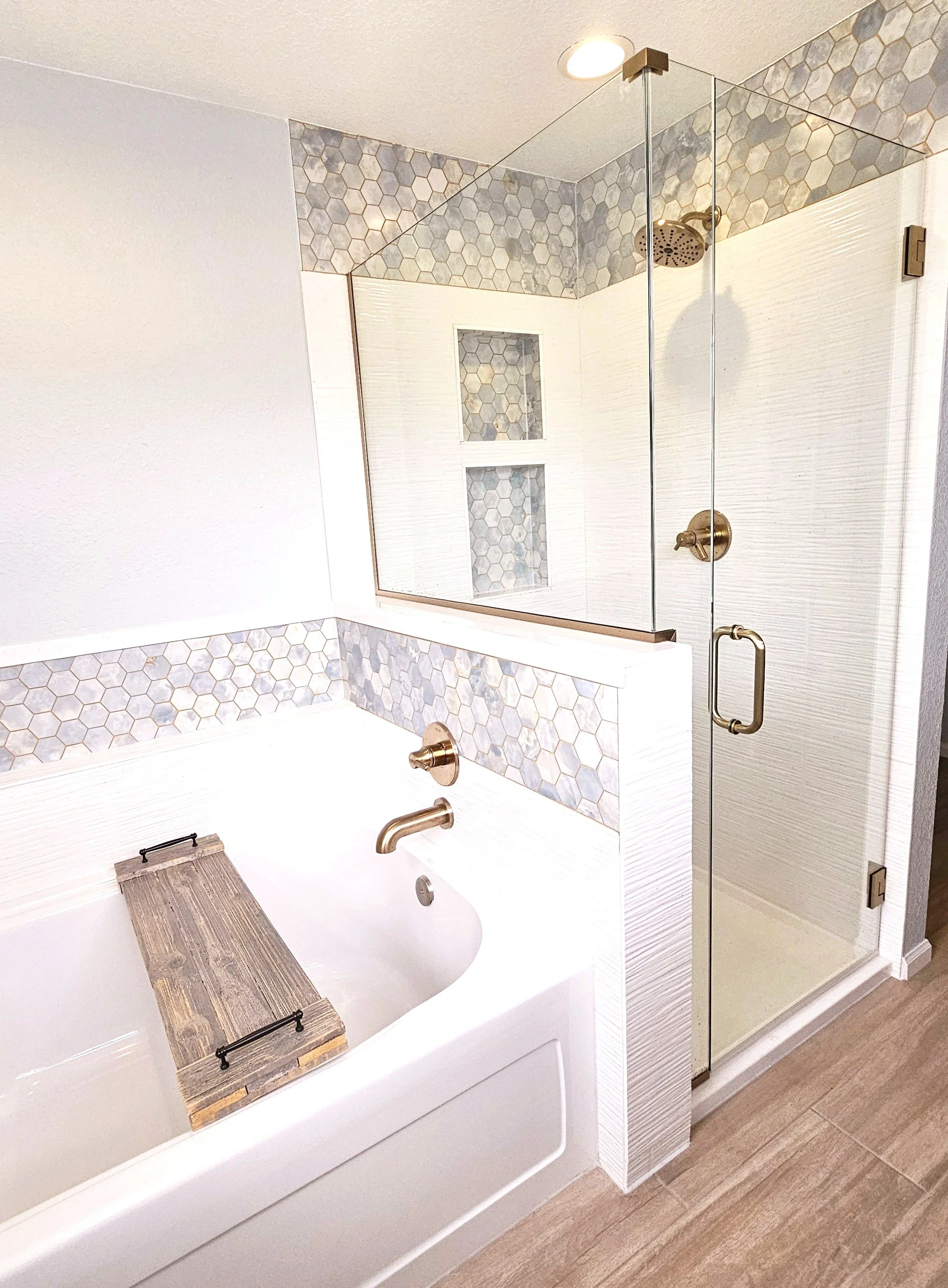 The soaking tub stayed — but everything around it was reimagined from the ground up. Iridescent hexagon tile runs as a continuous border, tying the tub surround and shower together into one cohesive statement. A frameless glass enclosure replaced the old brass frame, opening the space and letting the light move freely through it. Textured white wall tile adds quiet dimension, while brushed bronze hardware grounds every detail with warmth. The result is a bath that feels both serene and unmistakably intentional.